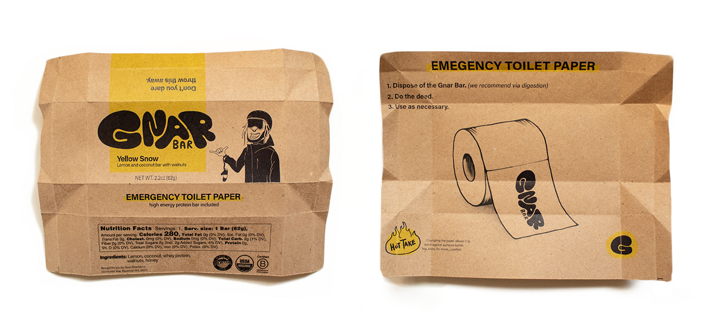 Gnar Bar is a conceptual product that reduces single-use waste in the outdoor industry. The dual-layer packaging can be recycled or repurposed. If you're camping in the backcountry, or travelling light on a trail run, Gnar Bar packaging can be used as fire starter, toilet paper, a finger brace, and a safety whistle.